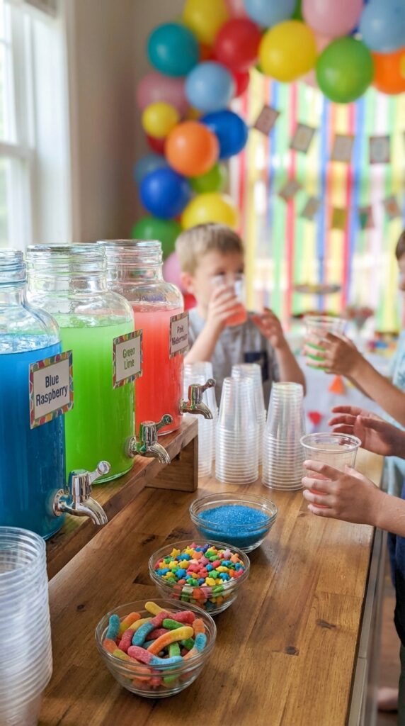 Now here’s where it gets exciting. Let guests add unique slurp juice garnishes like gummy worms, candy stars, and blue sugar rims to their cups. Provide a selection of toppings in small bowls for easy mixing.