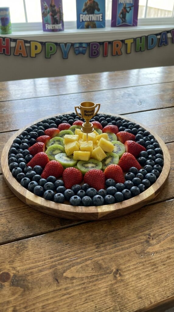 Place a small trophy-shaped toothpick flag at the center — that’s your “Victory Royale” spot. It’s visually striking, healthy, and honestly pretty easy to pull off with minimal prep time. To complete the full party look, pair this display with Fortnite-inspired birthday outfits for the guest of honor to really bring the theme together.