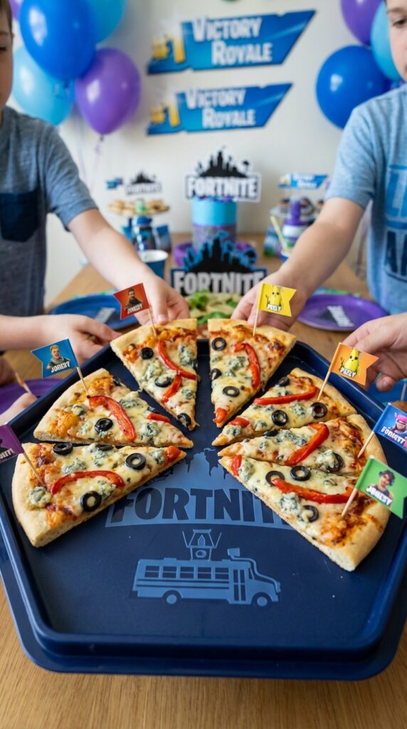Print small Fortnite character flags and stick them into each slice — instant Victory Royale presentation that’ll make the whole squad cheer before they’ve taken their first bite. Enhance the overall atmosphere by incorporating supply drops and camouflage accents around the pizza table to create a truly immersive Fortnite setting.