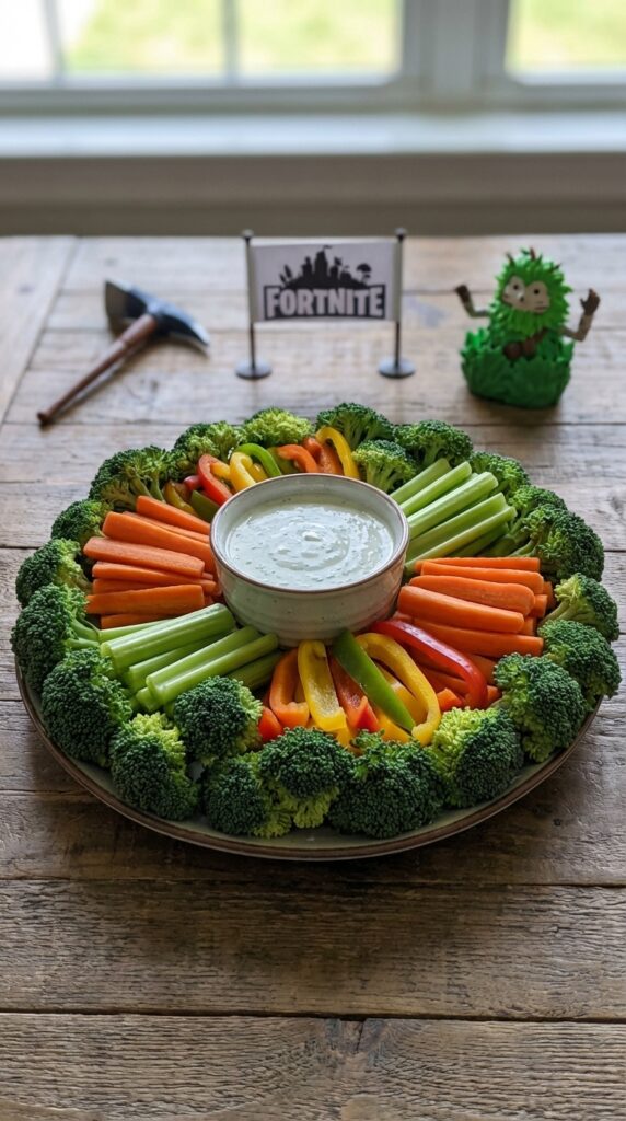 Even the sneakiest bush camper in Fortnite needs their veggies, so why not lean into the joke with a themed veggie tray? Arrange broccoli florets into a bush shape, then surround them with colorful carrots, celery, and bell pepper strips. The crunchy texture keeps kids engaged between rounds of gaming.