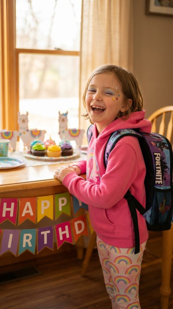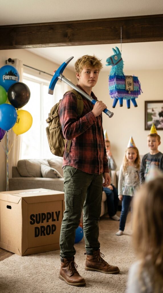 Don’t skip the details. Showcase Jonesy’s iconic accessories by adding a tactical backpack and a toy pickaxe. These finishing touches make the costume pop. Style your hair messy and slightly unkempt — Jonesy never looks overly polished. Trust me, guests will immediately recognize you the moment you walk through that door. For younger fans, Fortnite-themed toddler setups can bring the same vibrant energy to a second birthday party in a fun and age-appropriate way.