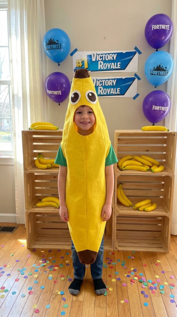 Hot-glue Peely’s signature goofy eyes onto a yellow hoodie if you’re keeping things simple. Either way, you’ll absolutely nail this costume without breaking the bank. To complete the scene, pair your Peely costume with supply drop decorations placed around the party space for a fully immersive Fortnite atmosphere.