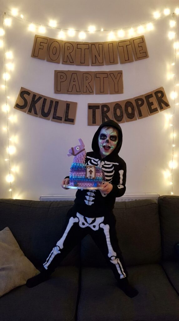 Now, here’s where things get really fun — the Skull Trooper is one of Fortnite’s most iconic skins, and you don’t need to spend a fortune to pull it off for your kid. Start with affordable skull trooper costume pieces like a plain black tracksuit from Target or Walmart, then add iron-on skeleton decals.