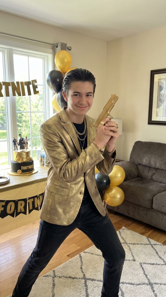 Pair a black bomber jacket with gold hardware details, and you’ve instantly nailed the Chaos Agent vibe without looking like you raided a costume store. To really showcase the full look, set up a Fortnite-inspired backdrop behind your cake table so every party photo captures the high-energy aesthetic you’ve worked so hard to create.