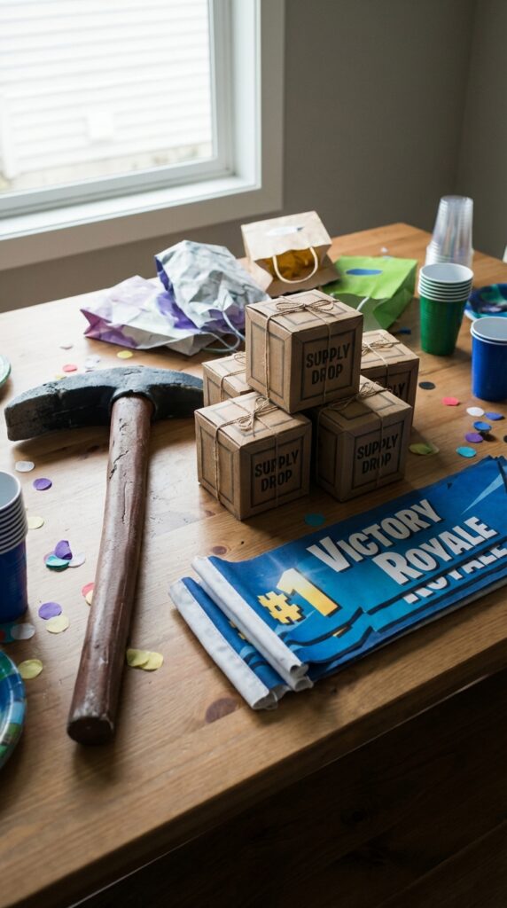 Grab a foam Harvesting Tool replica and watch the fun photoshoot ideas practically create themselves. Add creative party decorations like Supply Drop boxes and Victory Royale banners around your setup. These small additions alter your space into an actual Fortnite experience everyone remembers.