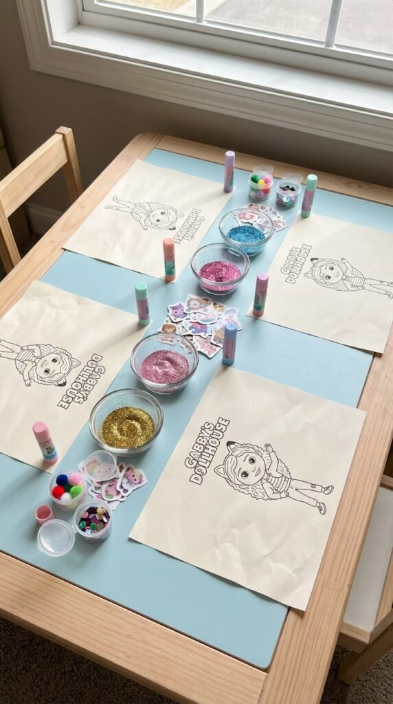 Your toddlers have enjoyed their treats and now they’re bouncing with sugar-fueled energy—perfect timing to channel that excitement into something creative. Set up a glitter sensory station where little hands can sprinkle sparkles onto pre-drawn Gabby outlines using glue sticks. Trust me, washable glitter is your best friend here (regular glitter becomes craft herpes—it spreads everywhere).