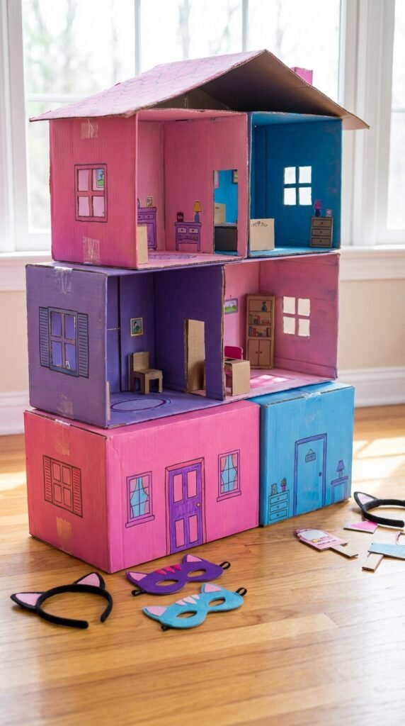 Convert a few large cardboard boxes into the ultimate image backdrop that’ll have your guests capturing visuals all afternoon. Stack and arrange boxes to mimic Gabby’s colorful rooms, then paint them in bright pinks, purples, and blues. Add windows, doors, and fun details with markers or construction paper to create authentic cardboard dollhouse decorations.