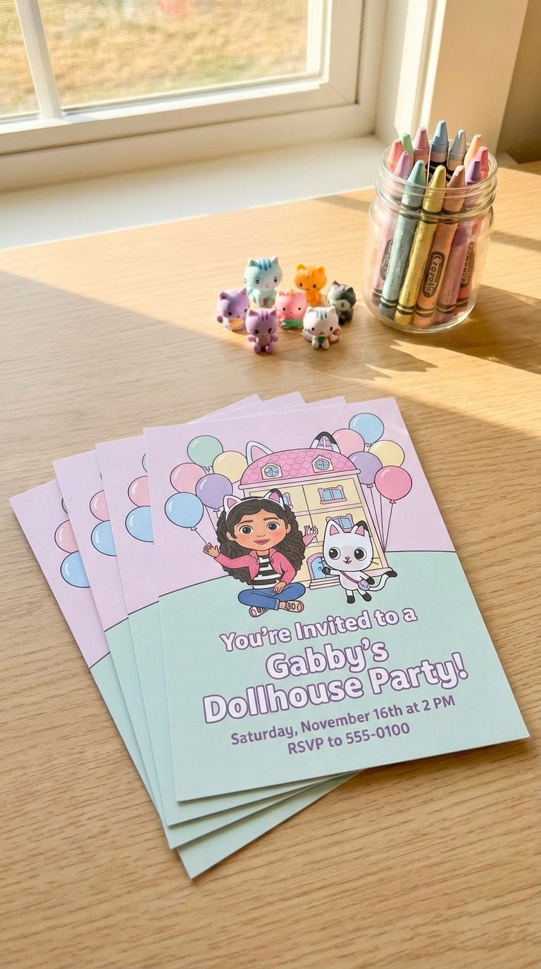Since your invitations set the tone for the entire celebration, you’ll want them to capture that playful Gabby’s Dollhouse magic right from the start. I’d stick with simple color schemes—think pink, blue, and purple—to keep things toddler-friendly without overwhelming little eyes. You can create eye catching graphic design by featuring Gabby and Pandy Paws front and center.