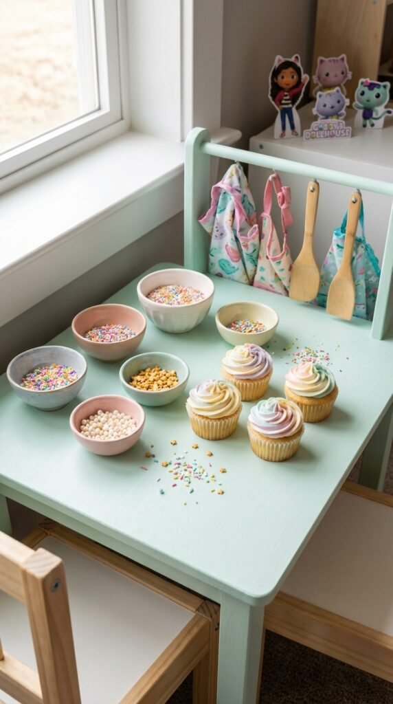 Set up a low table with pre-frosted cupcakes—trust me, you’ll want to handle the frosting application techniques yourself beforehand. Two-year-olds and spatulas? That’s a recipe for disaster.