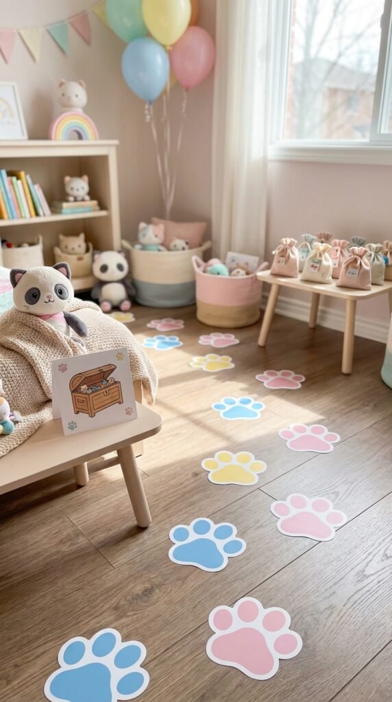 Design your treasure map layout with just three to four stops around your party space. Hide Pandy Paws plushies or cat-themed toys at each location, marking spots with colorful paw print stickers they’ll recognize instantly.