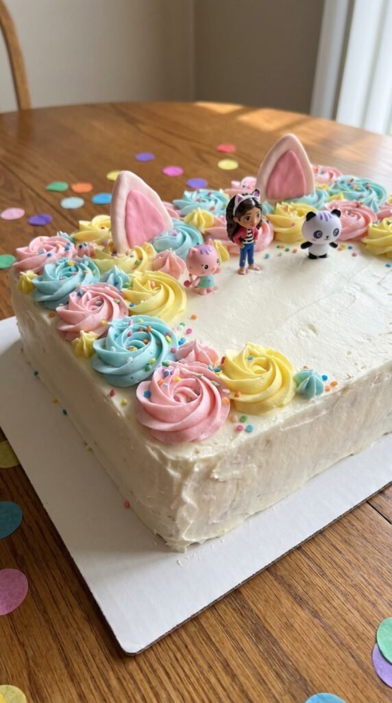 I always grab a simple sheet cake from the bakery counter, then use easy cake decorating techniques like rosette piping around the edges or creating Gabby’s signature cat ears with chocolate cookies. Add inexpensive plastic figurines on top, and you’ve got a professional-looking creation.