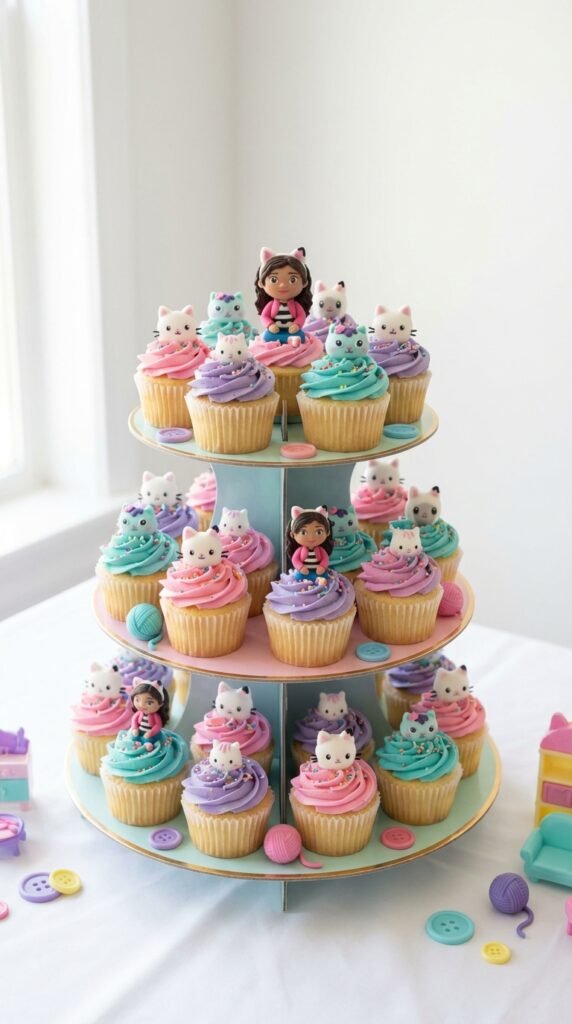 When you’re planning for a larger crowd or dealing with picky eaters, cupcake towers offer the perfect solution without sacrificing that Gabby’s Dollhouse magic. You’ll arrange colorful cupcakes on whimsical base tiers decorated with cat ears and rainbow patterns. Each cupcake becomes its own mini masterwork—frost them in pink, purple, and teal to match the show’s lively palette.