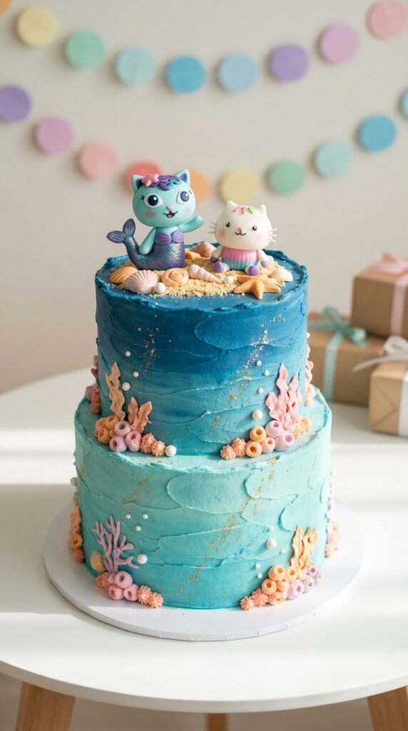 Place MerCat and Cakey figurines on top, swimming through their edible ocean paradise. Add edible pearls and gold dust for shimmer. Your little one will absolutely flip when they see their favorite characters diving into birthday fun. For an extra special touch, consider making whimsical pancake treats shaped like sea creatures to serve alongside this magical ocean cake.