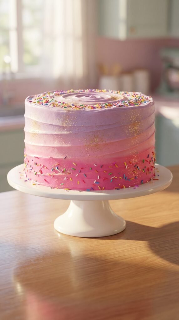The ombre color scheme works beautifully because it’s simpler than character decorations yet still feels magical.