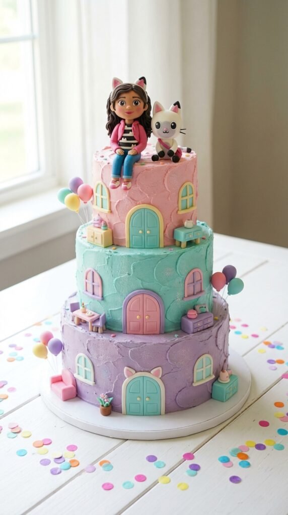 If you’re ready to truly wow your guests, nothing beats the showstopping impact of a multi-tiered dollhouse cake that mirrors Gabby’s magical world. Each layer becomes a different room, stacked to create that iconic house shape everyone recognizes.