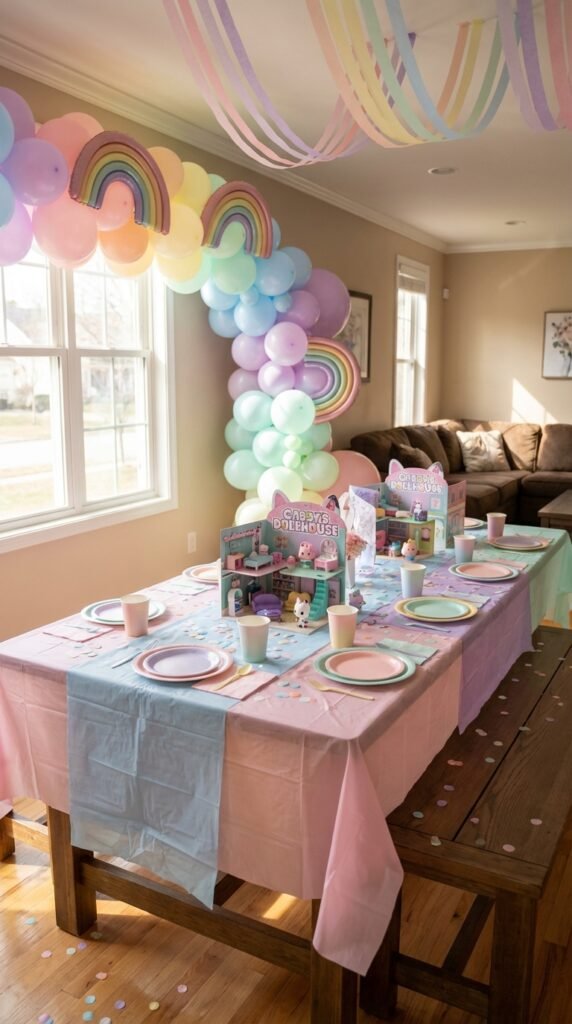 You’ll want to layer your pastel rainbow decor throughout the party space. Start with tablecloths in coordinating colors, then add balloon garlands featuring ombré shifts. I’ve found that hanging streamers in gradient patterns creates that imaginative dollhouse feel.