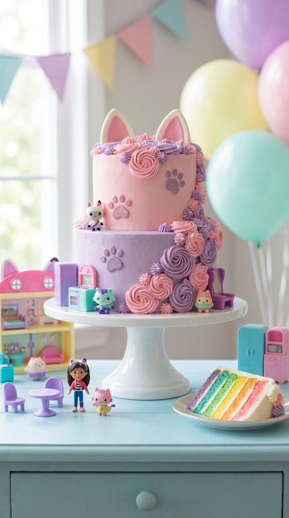 The birthday cake is absolutely the centerpiece of any Gabby’s Dollhouse party, and I’m here to tell you it doesn’t have to be intimidating. You can start with a simple round cake and alter it into something magical. Decorate with dollhouse accessories like tiny furniture toppers or miniature room scenes around the base. I’ve found that rainbow layers inside create the perfect surprise when you slice it.