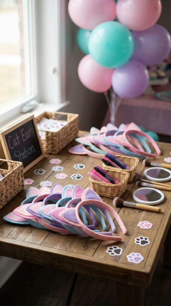I recommend setting up custom cat ear headbands at your entrance—you can DIY these using basic headbands and felt, or order pre-made versions in Gabby’s signature colors. Add each child’s name for that extra-special touch.