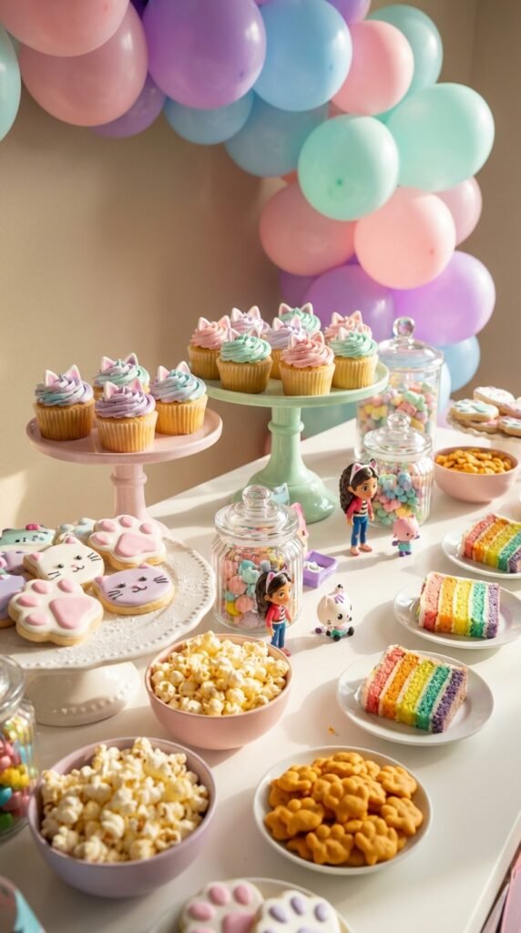I’ve found that cat themed desserts work beautifully here. Think cupcakes with fondant cat ears, cookies decorated as Pandy Paws, or a layered cake featuring Gabby’s face. The key is keeping designs simple enough to execute without professional help.