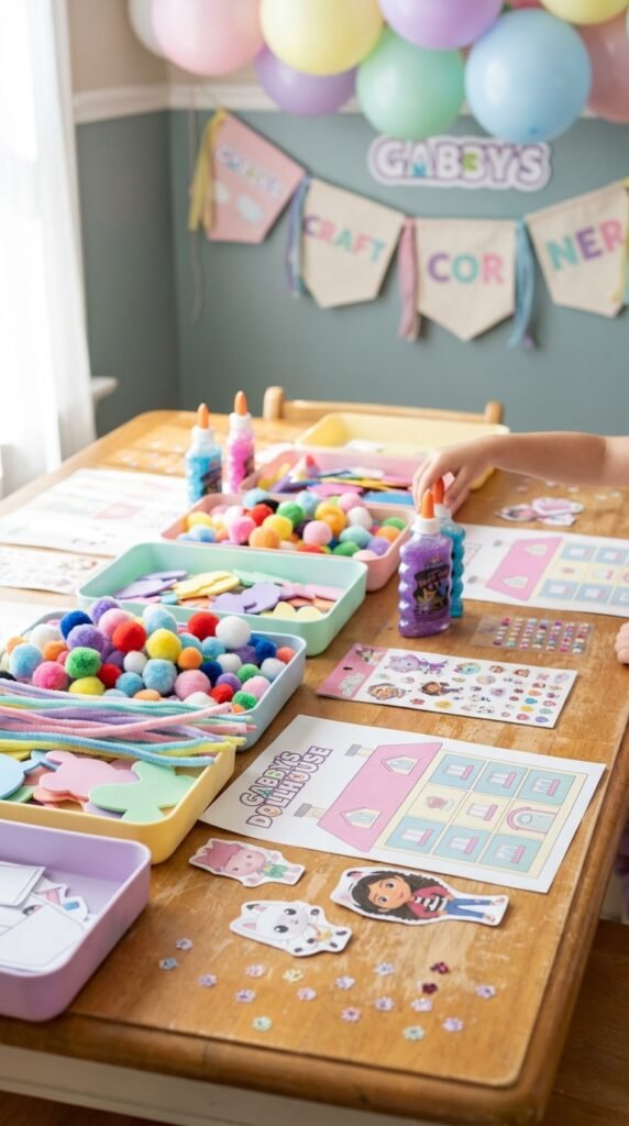 Set up tables with colorful craft supplies like pom-poms, pipe cleaners, and foam shapes. I’ve found that pre-cutting character silhouette templates saves time and prevents frustration—think Pandy Paws, Cakey Cat, and Gabby herself.