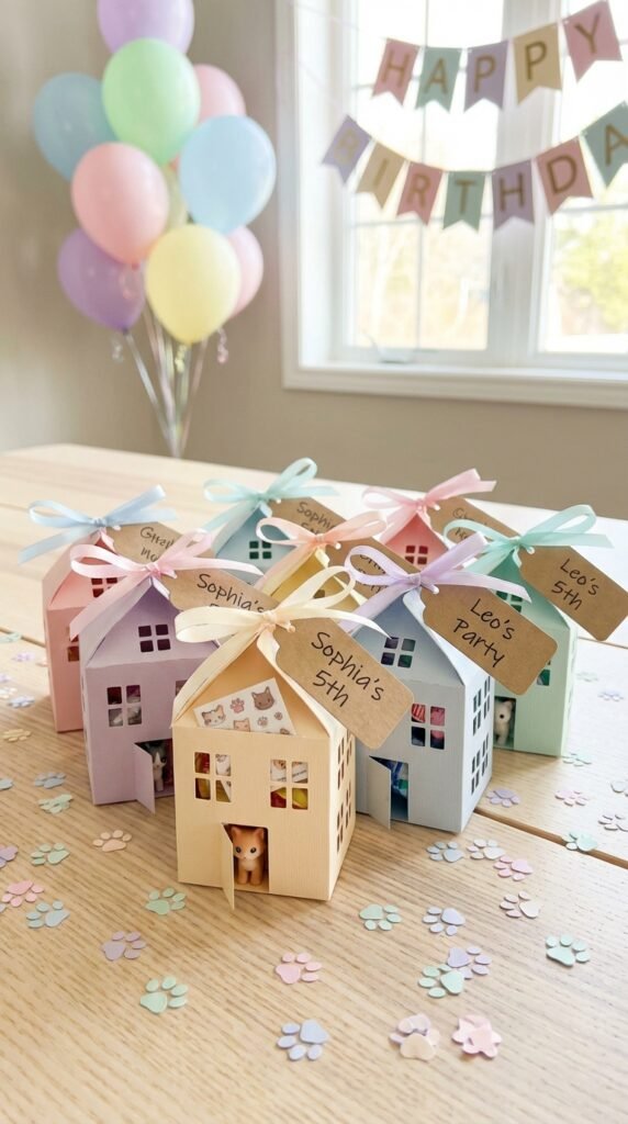 Mini dollhouse-shaped favor boxes are perfect for sending guests home with sweet memories. You can fill them with personalized trinkets like mini cat figures, stickers, or candy. I’ve found that kids absolutely love receiving something they can keep and treasure.