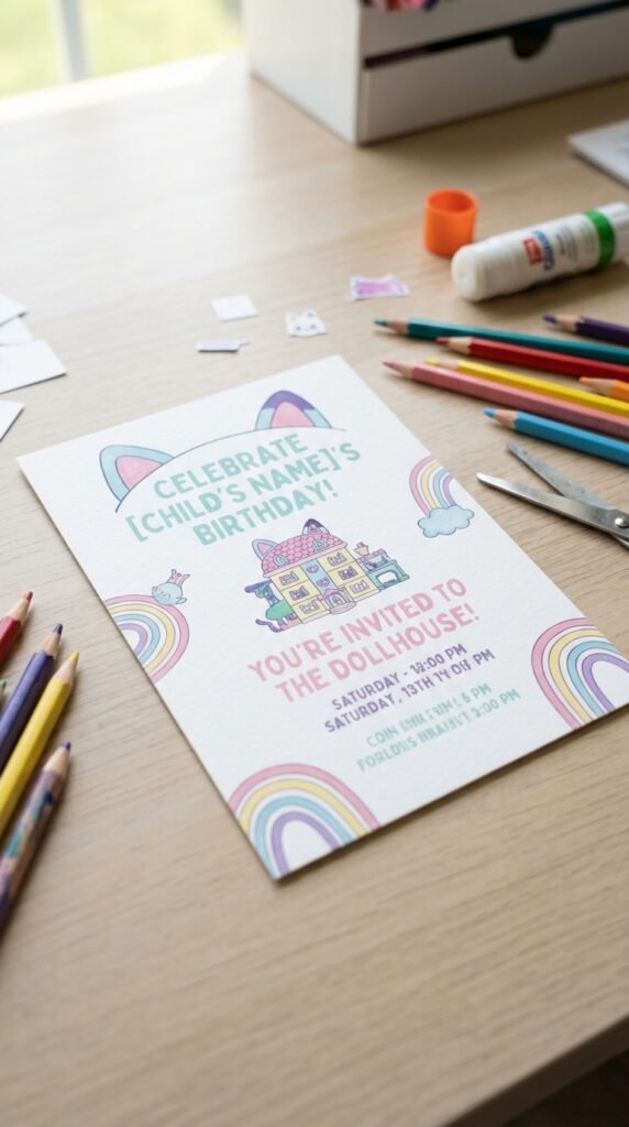 For a professional touch, consider ordering personalized dollhouse backdrops from Etsy sellers who specialize in custom party designs. They’ll composite your child’s image seamlessly into Gabby’s colorful world, creating keepsake-worthy invitations that guests won’t toss aside.