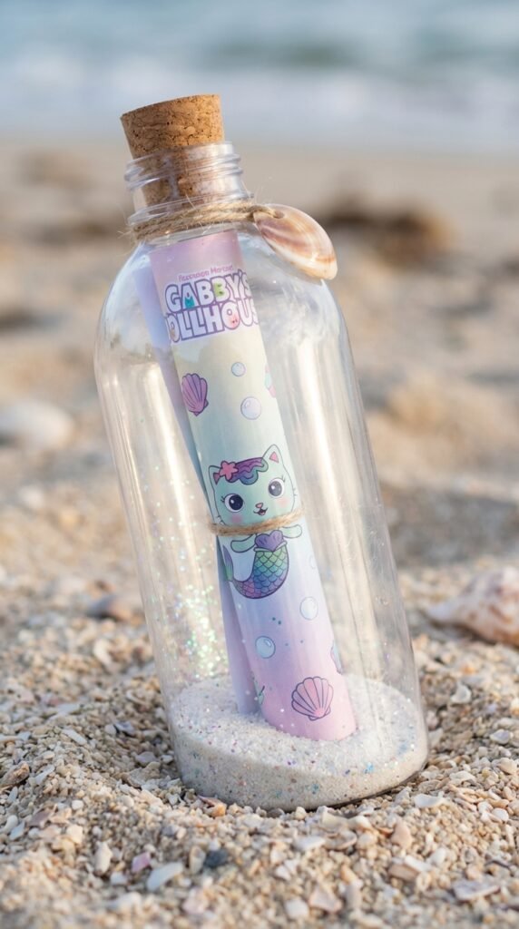 You’ll roll printed invites featuring creative underwater branding—think seashells, pearls, and MerCat’s signature teal colors—then slip them into small plastic bottles with sand and glitter. Add a cork or screw-top for easy bottle opening techniques (parents will thank you).