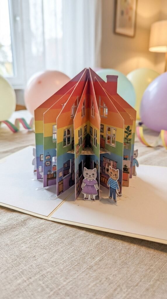 You’ll find pop up card templates online that feature multiple layers, creating depth and dimension. The best designs showcase Gabby’s iconic rainbow-striped house with separate rooms visible through die-cut windows.