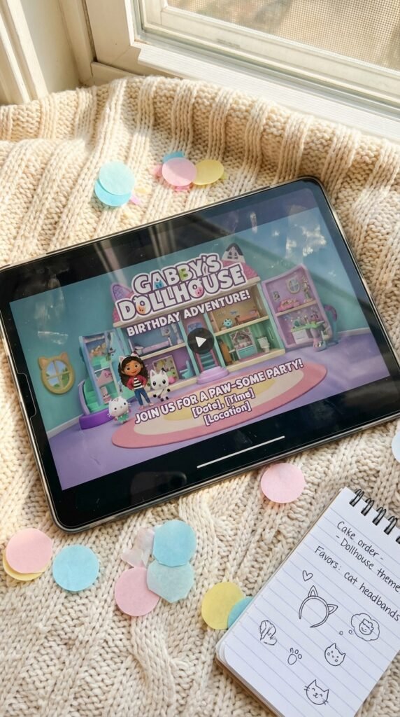 Apps like Canva and Animoto make this surprisingly simple. Design a video montage highlights reel featuring your child’s favorite characters announcing the celebration. Add animated passages between rooms, upbeat music, and clickable RSVP buttons. Your guests will feel like they’re stepping into an actual Gabby’s Dollhouse episode! You can even incorporate magical space decoration elements throughout your video invitation to give parents a preview of the enchanting party atmosphere their children will experience.