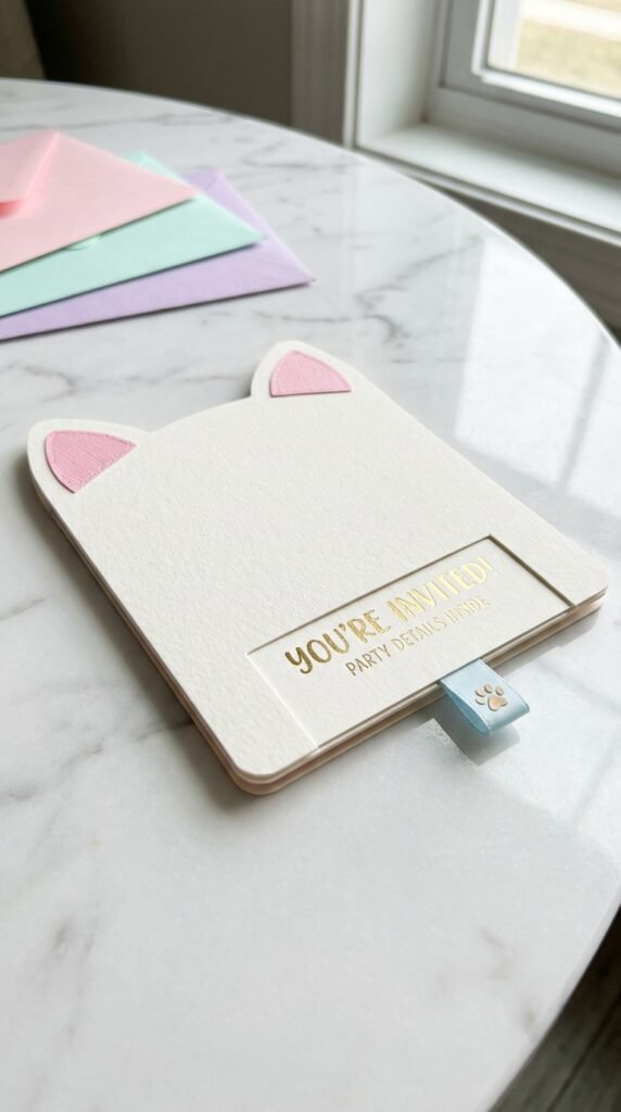 One of my favorite invitation styles alters the classic flat card into an adorable cat ear design that’ll make your guests squeal with delight. You’ll cut the top corners into triangular points, then add pink inner-ear details with colored cardstock or markers.