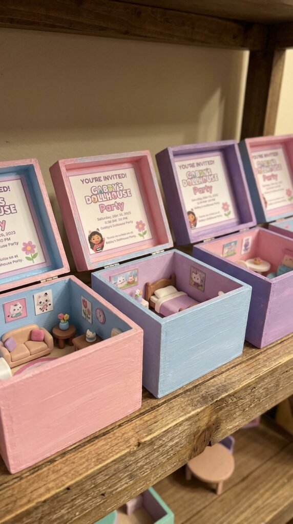 If you’re looking for something that’ll really wow your party guests, miniature room box invitations step up the creativity game in a big way. You’ll create tiny replicas of Gabby’s iconic rooms—think the Fairy Tale Garden or MerCat’s ship—and tuck the party details inside.