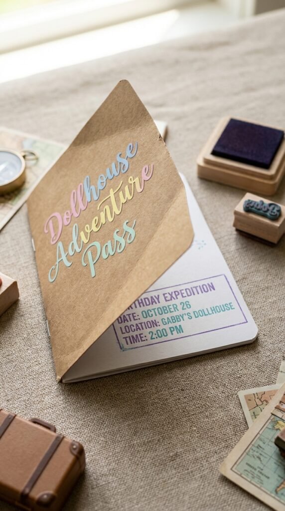 When you design invitations that look like actual passports, you’re promising guests an expedition they can literally hold in their hands. Create booklet-style invites with a cover featuring each child’s name and “Gabby’s Dollhouse Visitor” stamped across it.