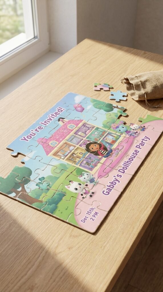 Interactive invitations take the excitement up several notches, and puzzle piece invites get kids engaged before they even arrive at the party. You’ll send each guest a simple jigsaw puzzle featuring Gabby and her cat friends, with party details printed across the pieces. The interactive assembly becomes an activity itself—kids love putting puzzles together, and this one reveals when and where to celebrate.