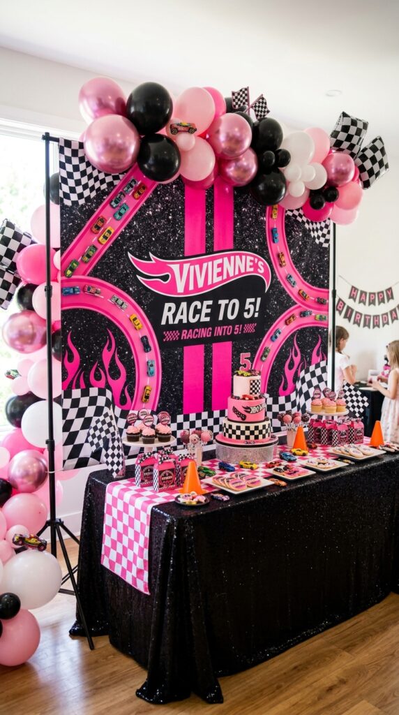 Every great party needs a showstopping focal point, and a pink and black Hot Wheels racing backdrop delivers exactly that.