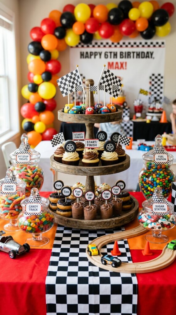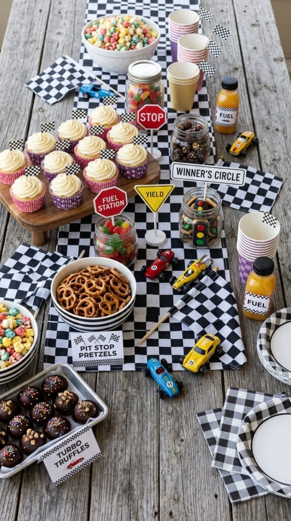 Add themed cake pops shaped like race cars and cupcakes topped with edible tire prints. For an extra creative touch, decorate your cupcakes with racing flag designs and colorful tire track patterns that bring the whole race theme to life. Label everything with fun racing names like “Pit Stop Bites” or “Finish Line Fudge.”