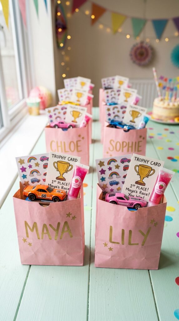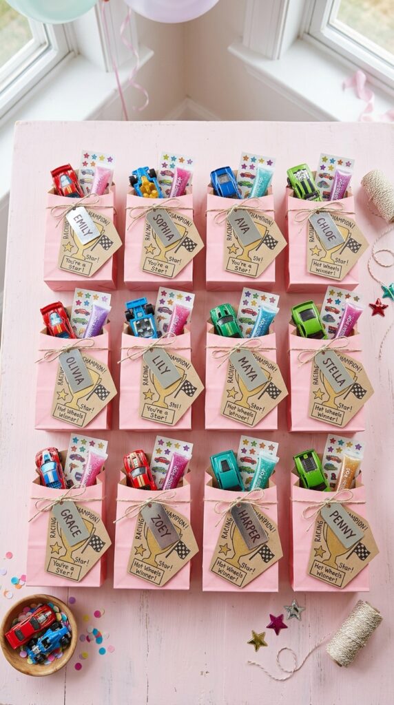 Bag customization takes the whole thing up a notch. Add each child’s name using metallic markers on pink kraft bags, then tuck in a handwritten racing “trophy card” celebrating their attendance.