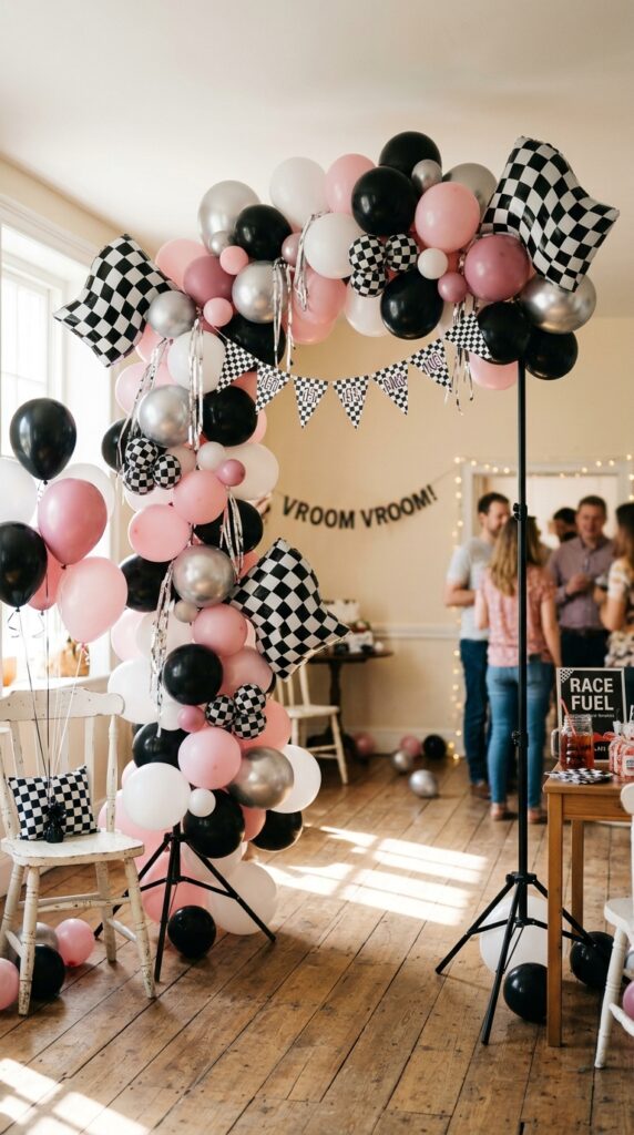 Pair the arch with a checkered table runner beneath your cake and snacks to tie the whole racing theme together seamlessly.