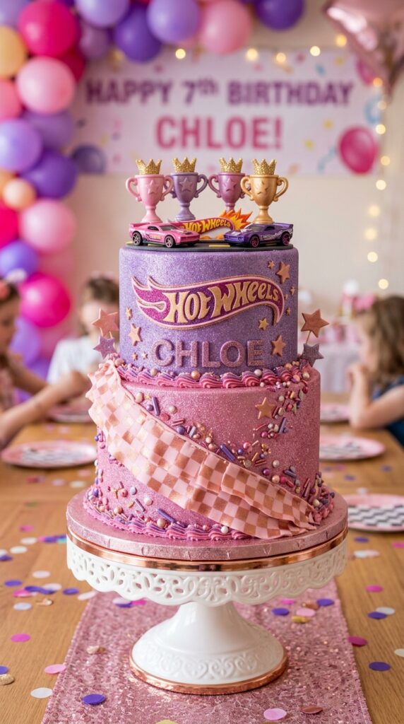 The cake is honestly where you can have the most fun with this theme. Imagine a classic Hot Wheels car design, but swap the bold primary colors for soft pinks and purples.