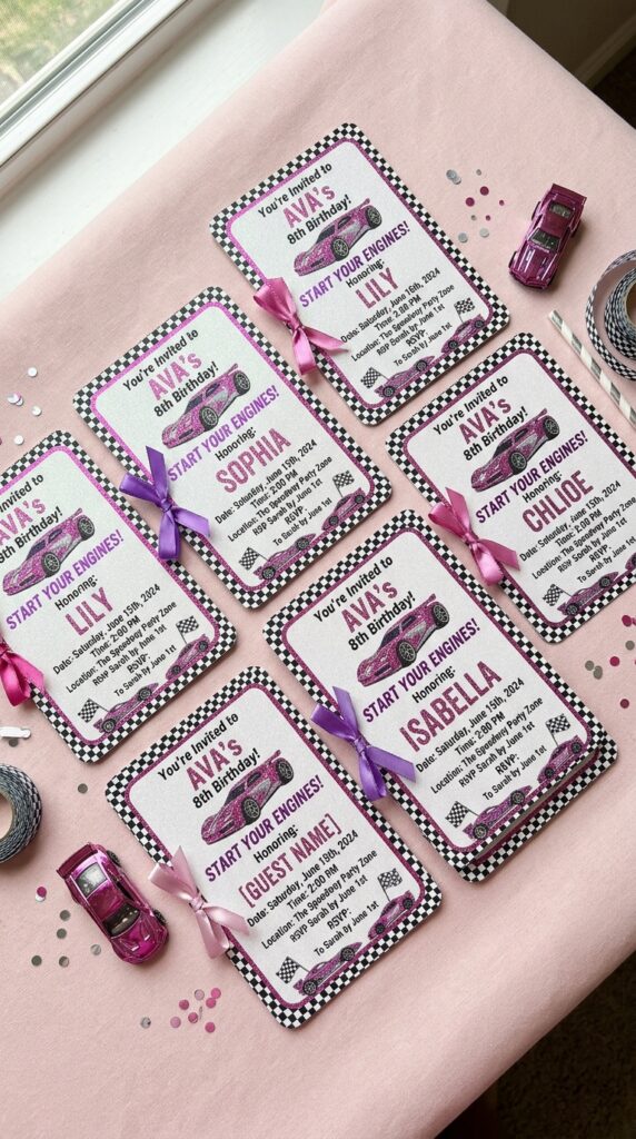 Design a personalized race car countdown invite that builds excitement before the big day. Think bold fonts, checkered flag borders, and a glittery guest list section where each name feels special.