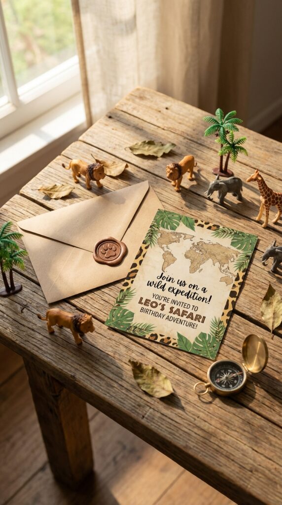 You can find printable templates online or order custom cards through Etsy sellers who specialize in safari themes. Add themed stamps — think lions, elephants, or palm trees — to the envelopes for a charming finishing touch. Popular safari invitation designs often incorporate bold typography and earthy tones like olive green, tan, and burnt orange to reinforce the adventurous aesthetic.