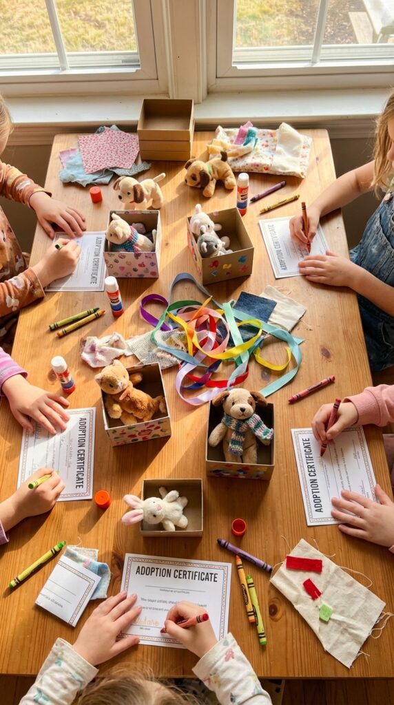 Set up a craft station with small toy animals and craft supplies like fabric scraps, ribbon, and mini adoption certificates.