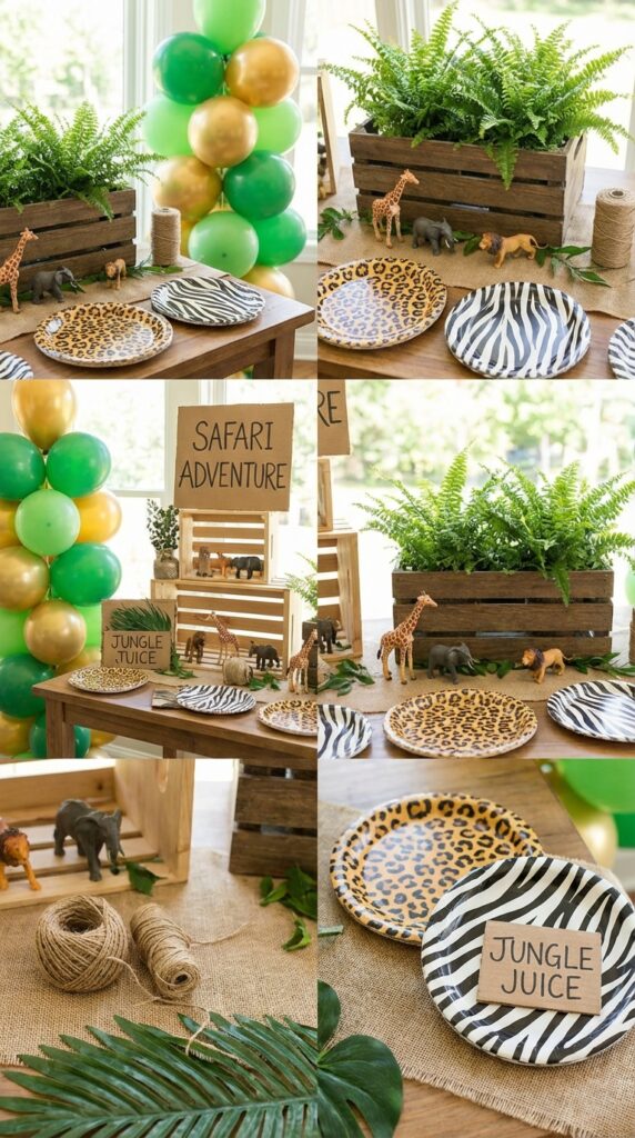 Even simple clusters of jungle-colored balloons tied to chairs make everything feel intentional and festive without stretching your budget uncomfortably thin.