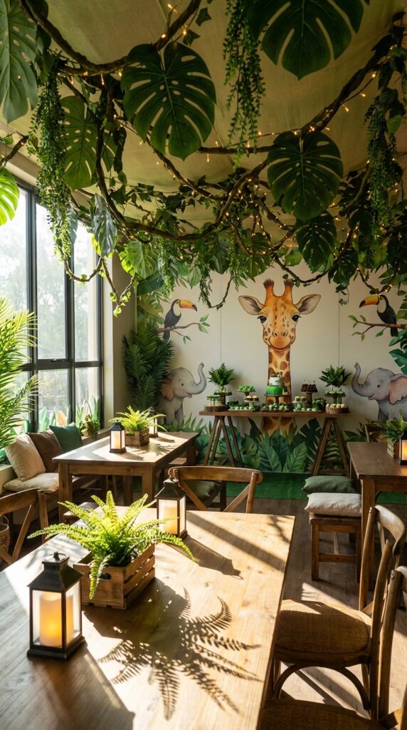 For a more intentional look, consider safari-themed backdrop designs that layer multiple jungle elements together to create a fully immersive atmosphere.