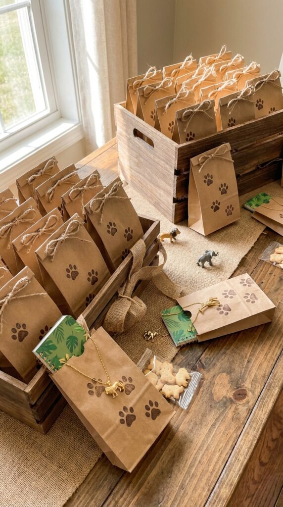 Keep the packaging consistent — kraft paper bags with twine and a stamped paw print seal the whole safari aesthetic beautifully.