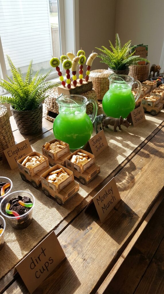 Label everything with fun safari signs like “Elephant Ears” for chips or “Monkey Munch” for popcorn.