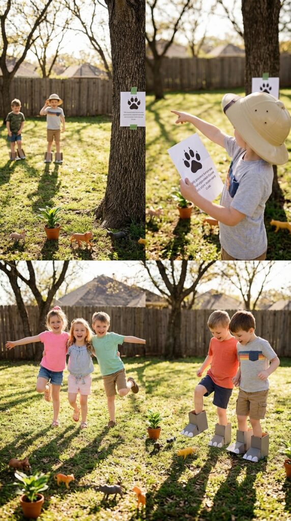 Set up treasure hunts where little ones follow animal tracks to hidden prizes. You can print paw print clues and scatter them across your yard for extra excitement.