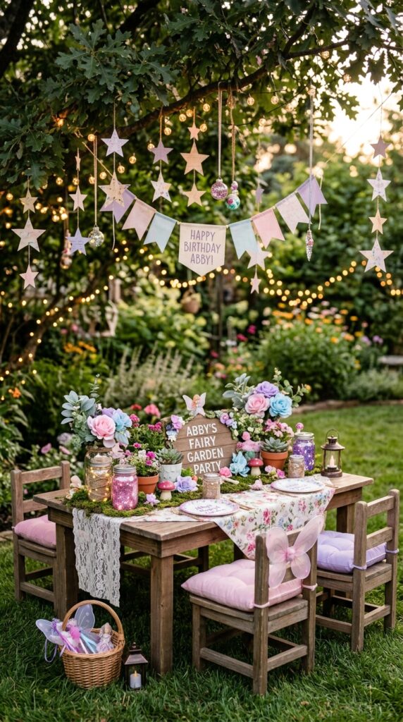 Revive your party space by weaving fairy lights through small potted plants and decorative mushrooms. Add glitter jars filled with pink and purple sparkle for an extra magical touch — they double as adorable centerpieces.
