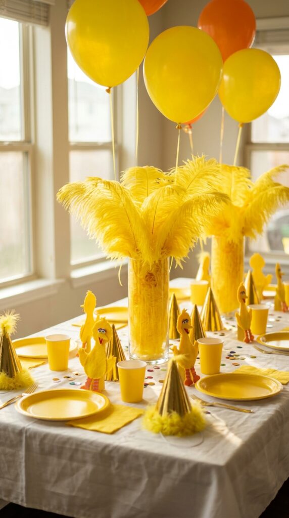 For Big Bird centerpieces, try tall yellow feather arrangements inside simple vases — they’re eye-catching without being overwhelming.