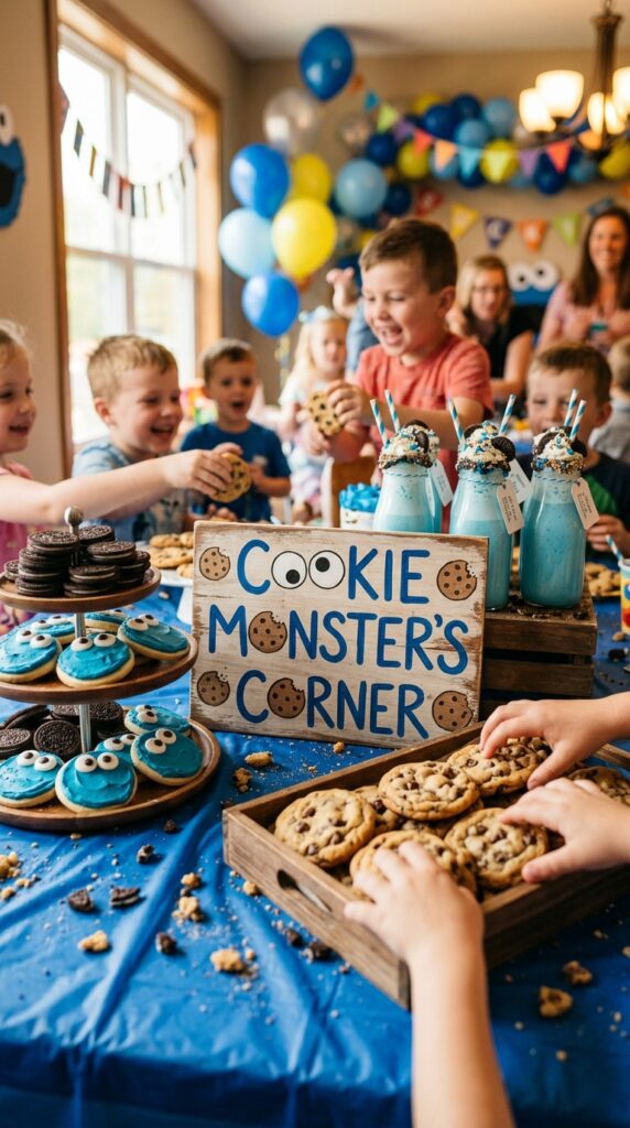 Set everything up on a blue-draped table with a “Cookie Monster’s Corner” sign.