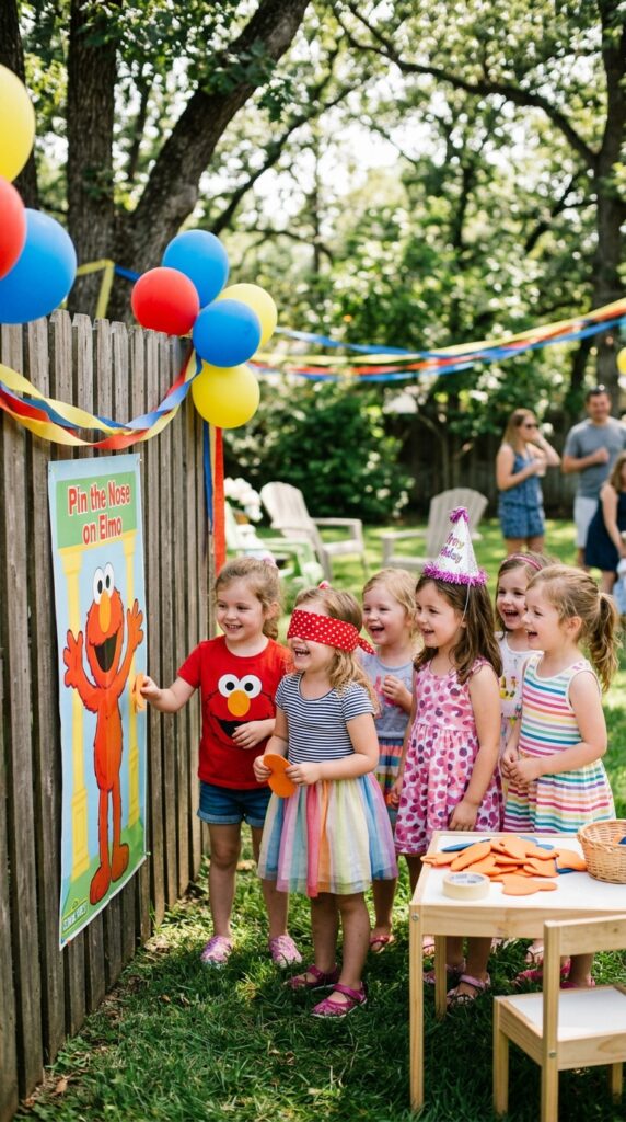 “Pin the Nose on Elmo” is a crowd-pleaser that’s easy to DIY with a printed Elmo poster and foam nose cutouts.